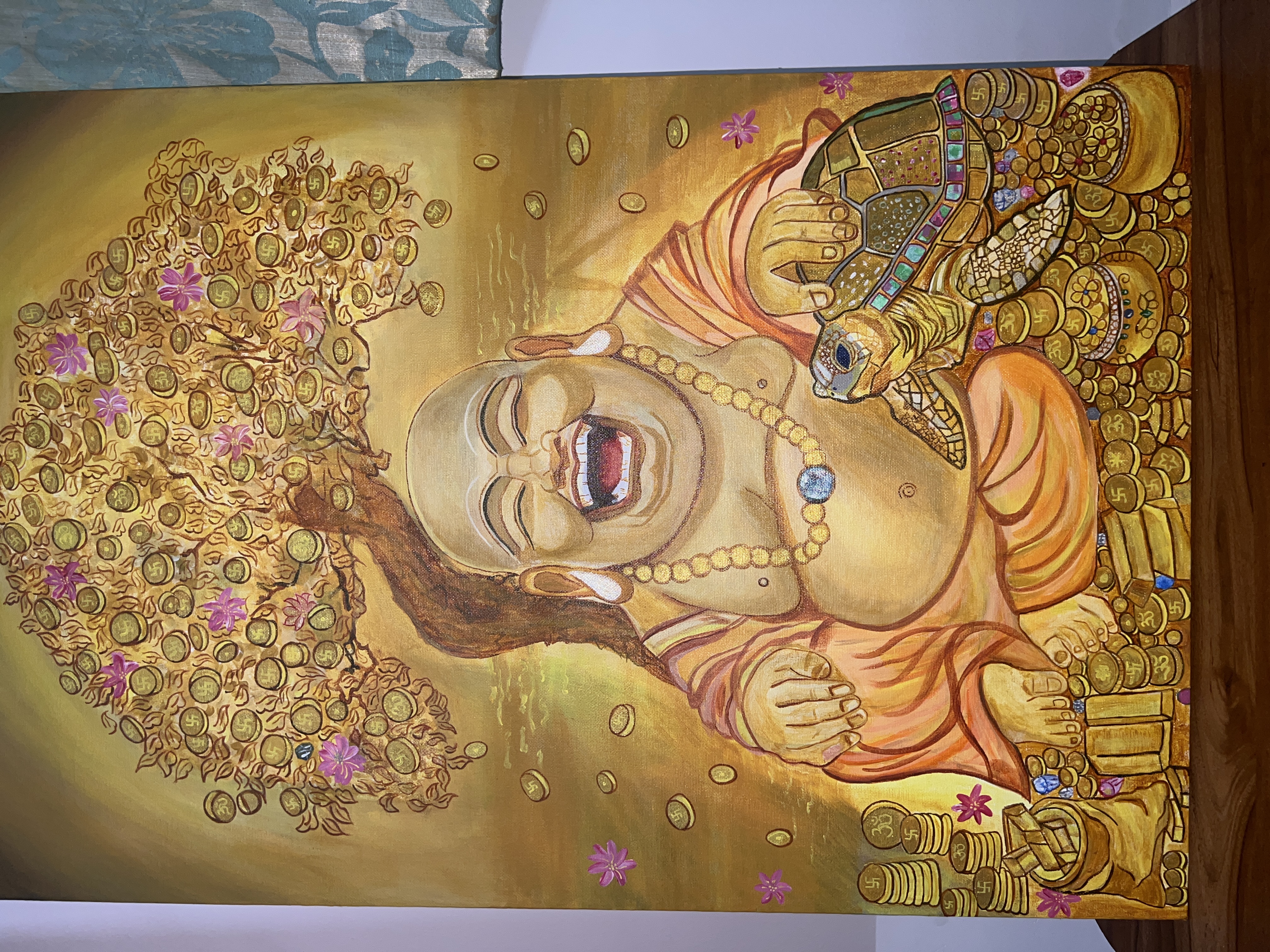 Wealth giving buddha with Kalpavriksha and treasure tortoise