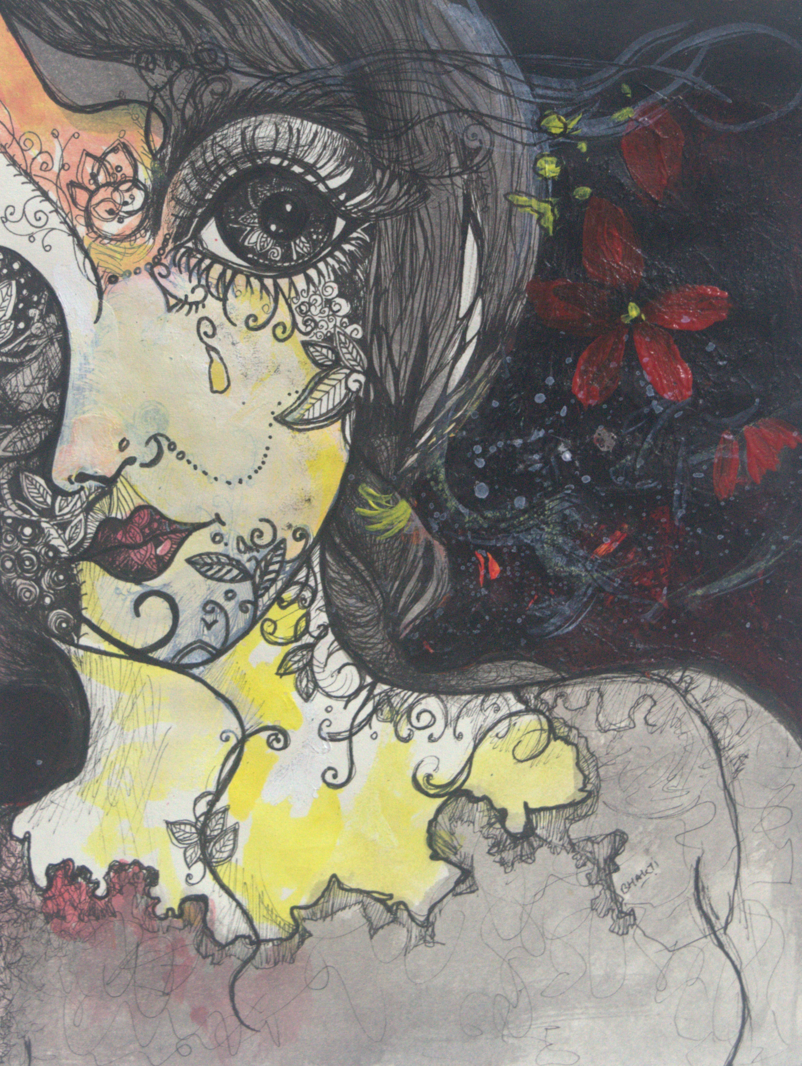 This artwork expresses empathy and understanding through contrast and emotion, showing the duality of pain and comfort that compassion embraces.